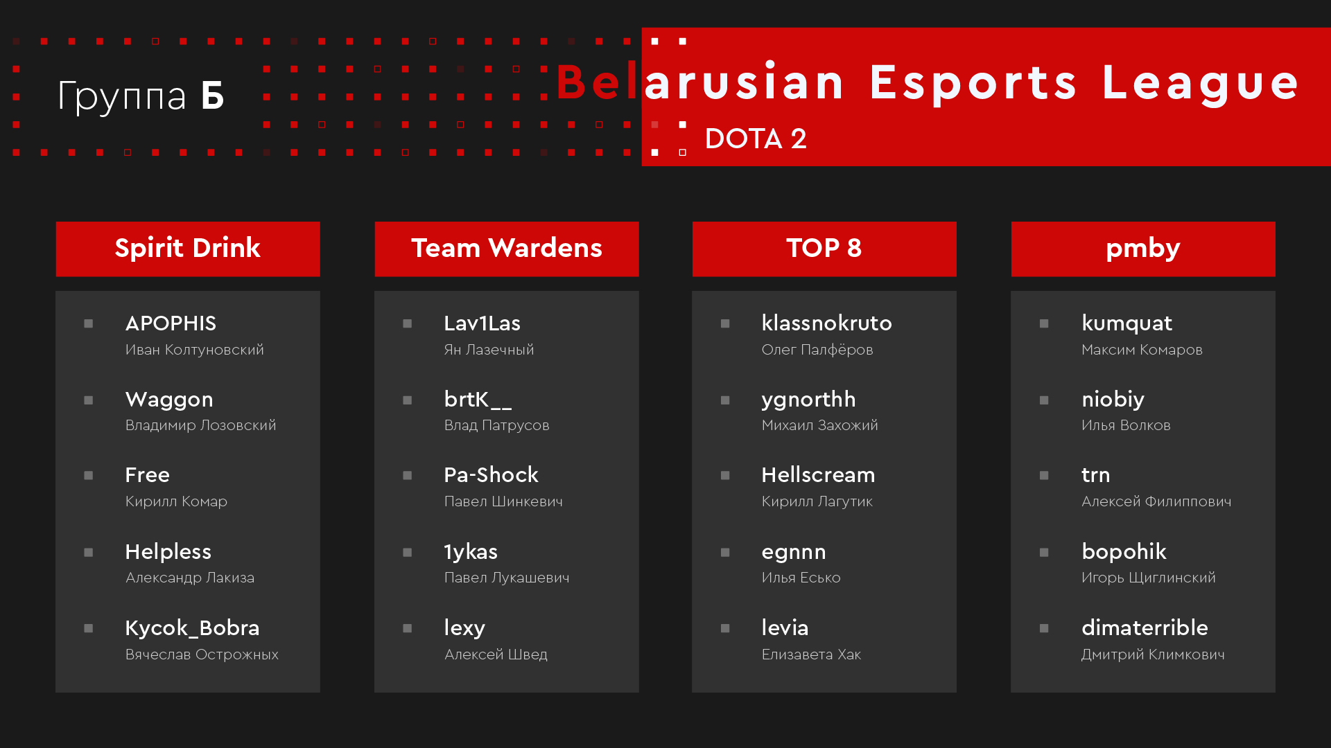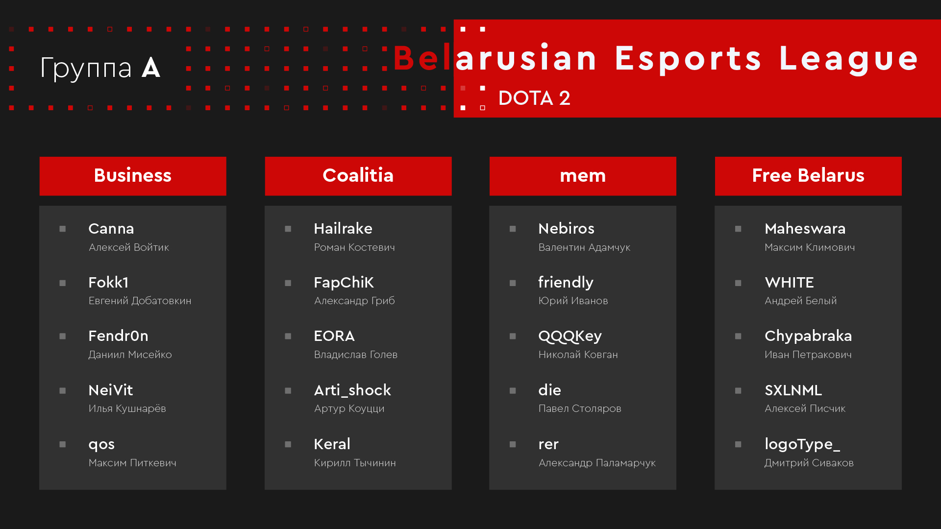 Belarusian Esports League — онлайн-лига, созданная для начинающих игроков. Профессиональные киберспортсмены и приравненные к ним внесены в бан-лист и не могут принять участие в соревнованиях.